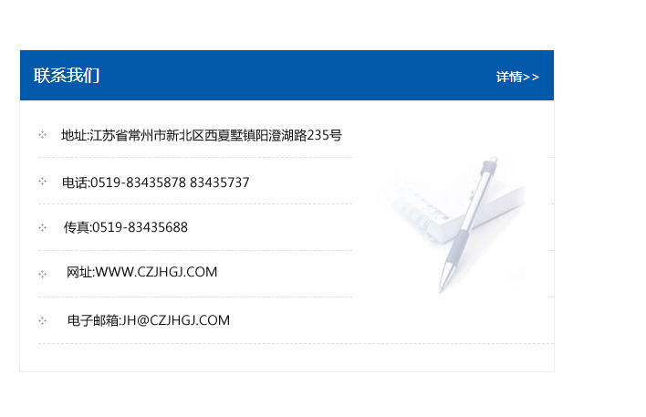 地址:常州市新北區友邦商務大廈1幢16、17層  電話:0519-85101652  傳真:0519-85112595  郵編:213022  網址:www.cz-jiayue_cn.zhyysm.com  郵箱:xiajifengaa@163.com